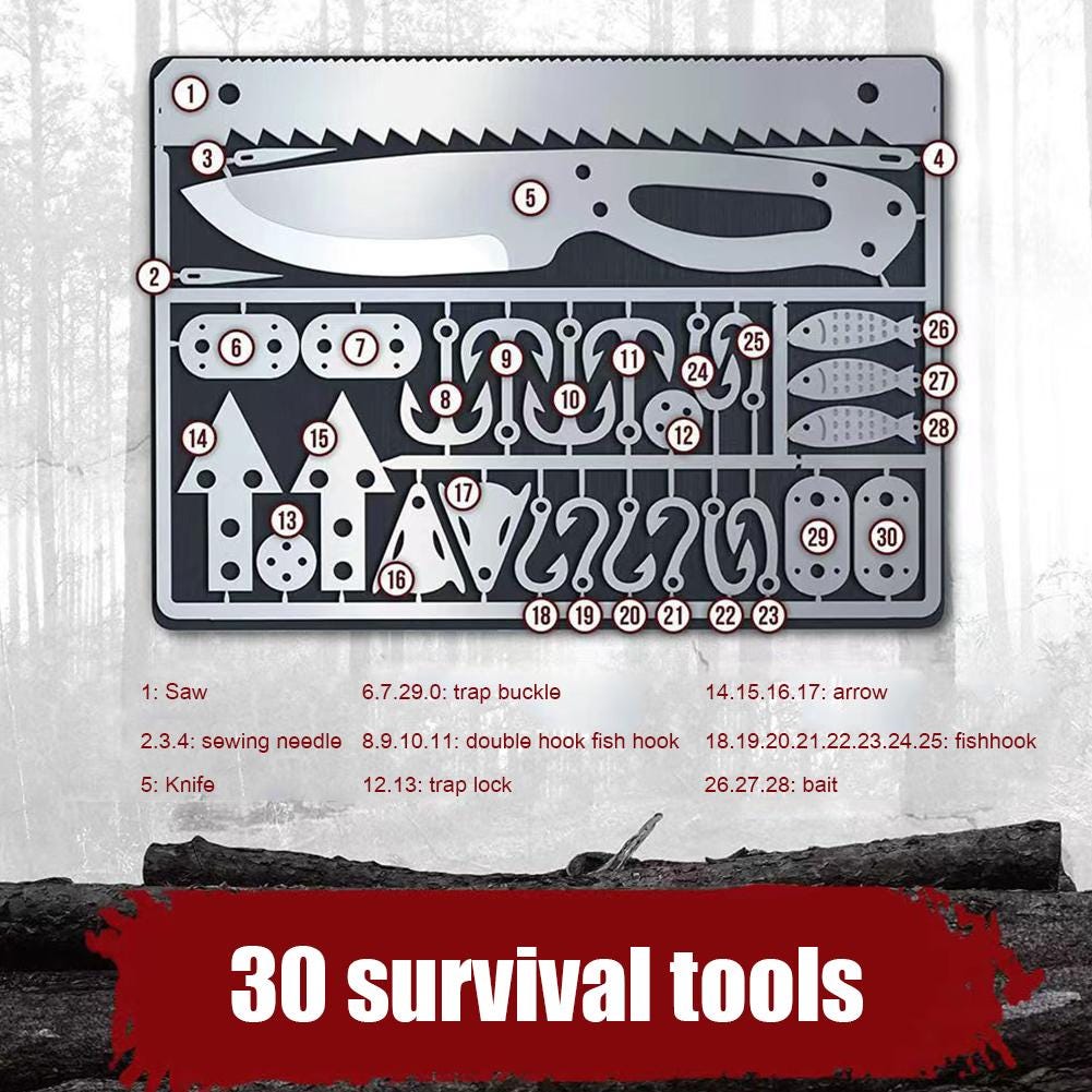***Brand New*** 30 in 1 Survival tool card, credit card sized tools designed to fit in a wallet. Provide a variety of essential functions, from sewing, cutting, and sawing to fishing, trapping, and hunting, compact, versatile, durable, and convenient tools that can be a valuable addition to your everyday carry setup, survival kit or bug out bag, is a great emergency tool to carry around on a daily basis. made of stainless steel, so they are highly resistant to corrosion and have a wide range of tools. ***The picture is for reference only*** Notes: