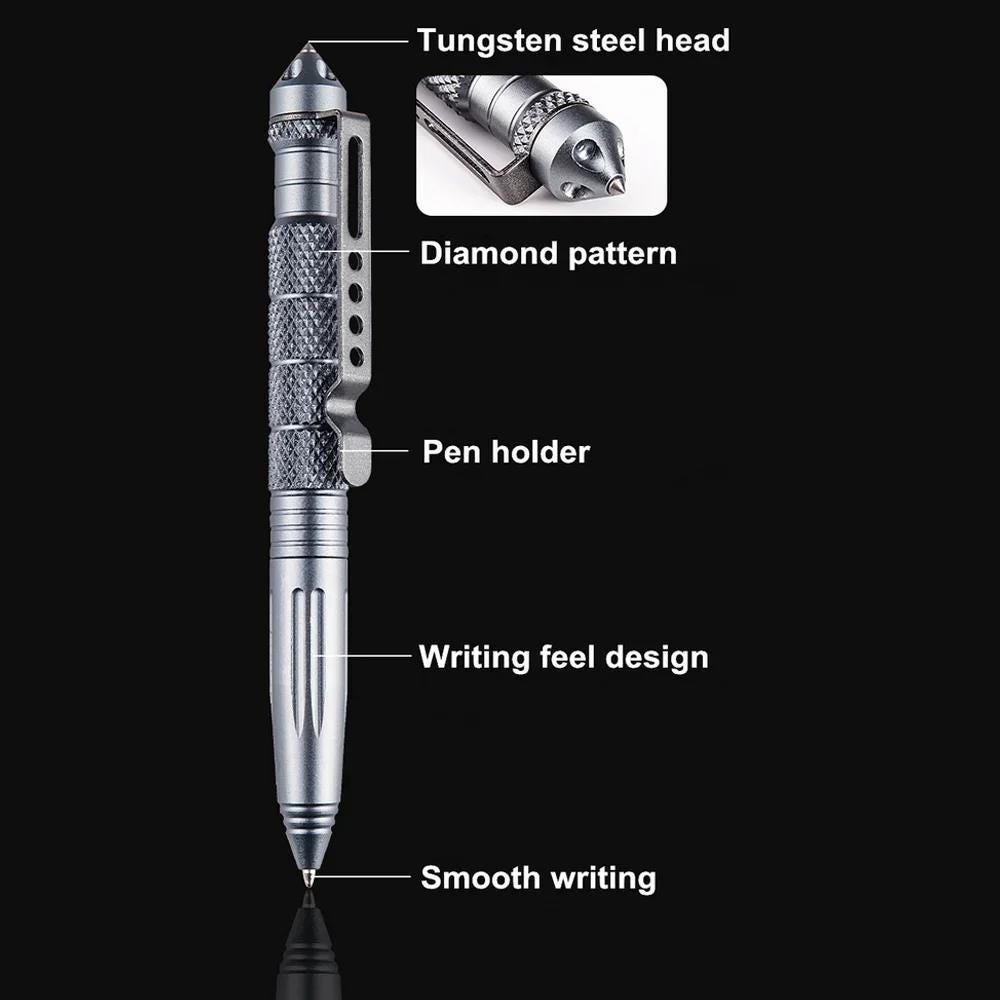 The Military tactical pens withstand all conditions, is made of military-grade aluminum and features an ultra-durable carbide tip for emergency situations. If you're trapped or need to extricate someone from a vehicle, use the end of the pen as a window breaker for easy escape.