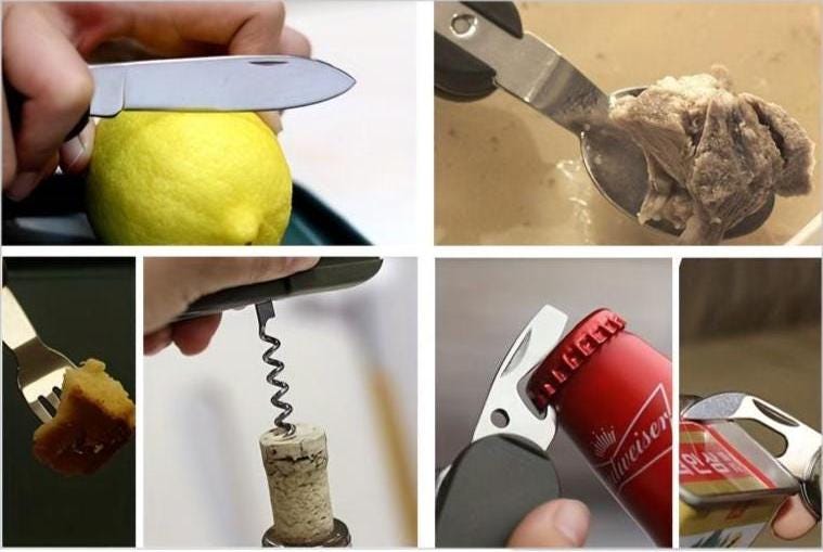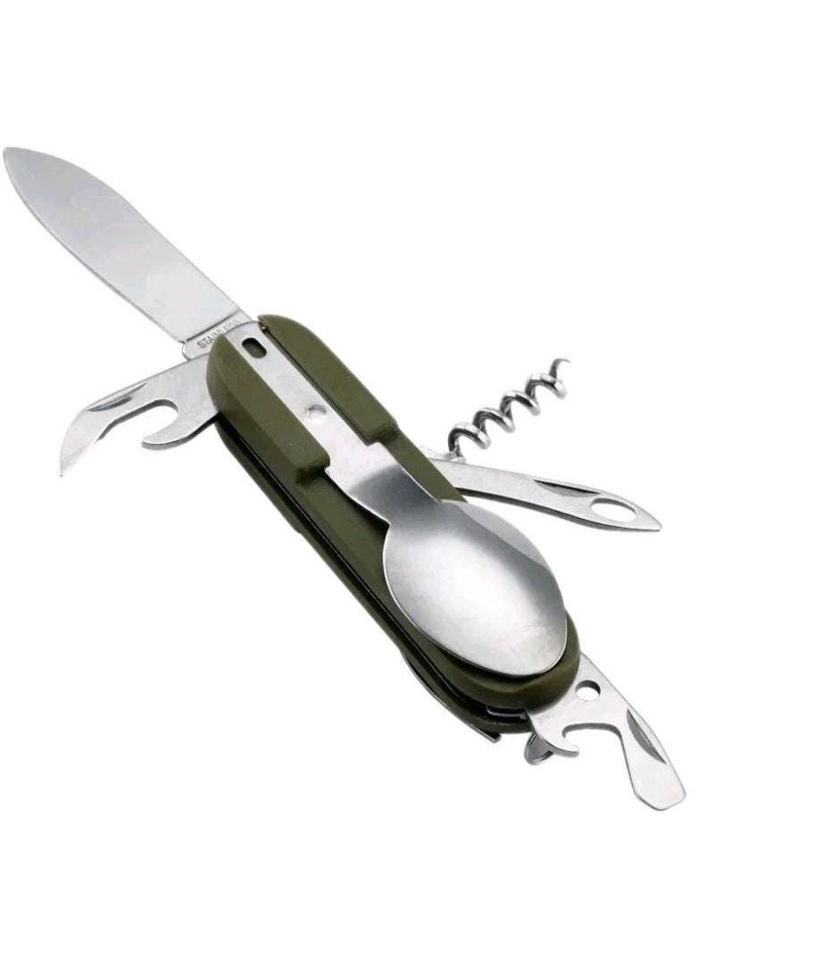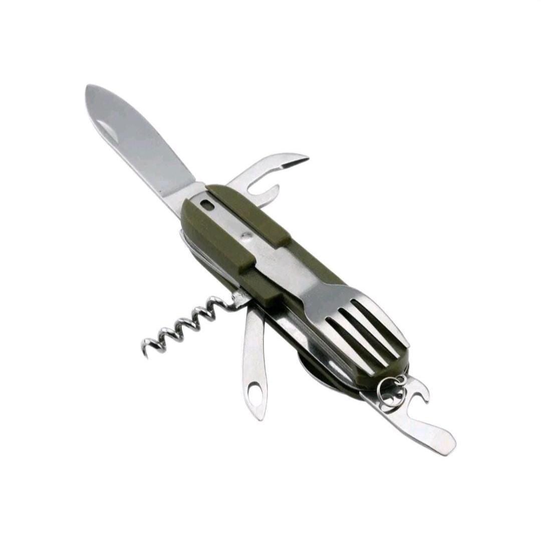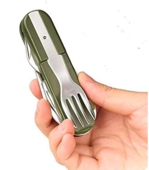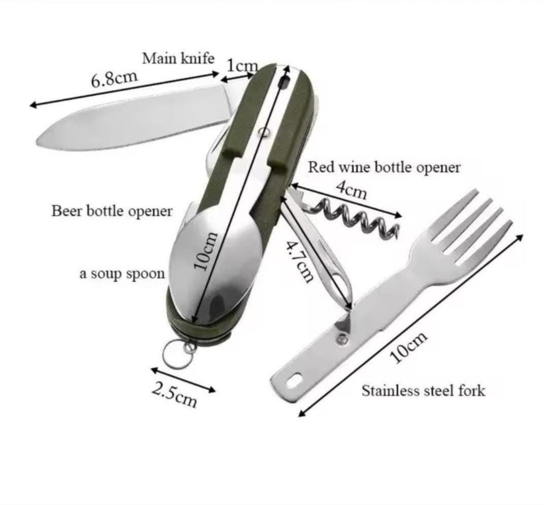 ***Brand New*** 7 in 1 Tableware Stainless Steel Kit Set. Includes spoon, fork, knife, can opener, bottle opener, corkscrew and fishing line hole, the whole set of equipment.